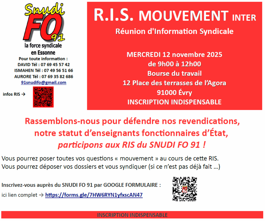 R.I.S. MOUVEMENT interdépartemental le mercredi 12 novembre 2025 de 9H00 à 12H00 Bourse du travail à EVRY 17 octobre 202517 octobre 2025 par admin4997, publié dans Réunions d'Information Syndicale Inscrivez-vous auprès du SNUDI FO 91 par GOOGLE FORMULAIRE :ici lien complet → https://forms.gle/7HW6RYN1yfxscAN47 RIS MOUVEMENT SNUDI FO 91 mercredi 12 NOVEMBRE 2025 BOURSE EVRY COMMUNIQUETélécharger