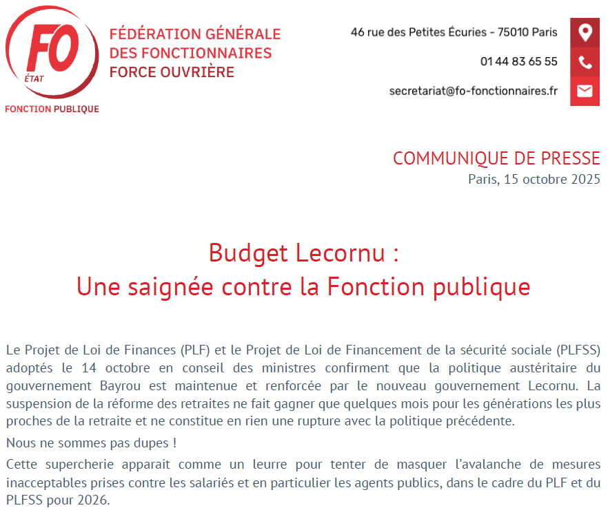Budget Lecornu : Une saignée contre la Fonction publique 3 novembre 2025 par admin4997, publié dans COMMUNIQUE, SALAIRE PRIME REVENUS 20251015-communique-de-presse-fgf-fo-budget-lecornu-une-saignee-contre-la-fonction-publiqueTélécharger