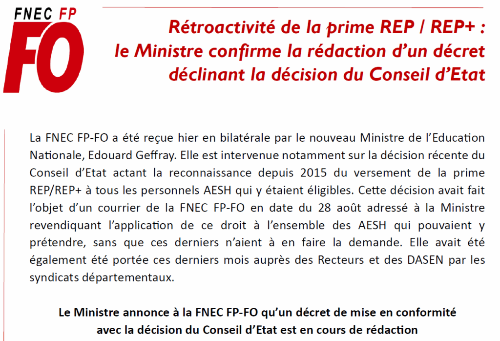 Rétroactivité de la prime REP / REP+ : le Ministre confirme la rédaction d’un décret déclinant la décision du Conseil d’Etat 14 novembre 2025 par admin4997, publié dans AESH, REP REP+ EAP ou N, SALAIRE PRIME REVENUS 25-10-29-Retroactivite-de-la-prime-REP-pour-les-AESH-le-ministere-se-conforme-a-la-decision-du-CETélécharger