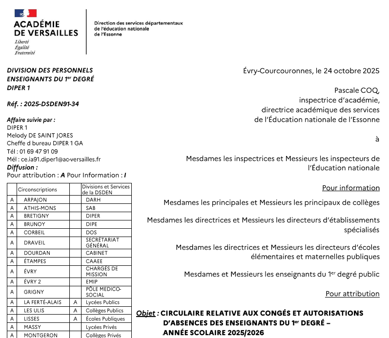 CIRCULAIRE RELATIVE AUX CONGES ET AUTORISATIONSD’ABSENCES DES ENSEIGNANTS DU 1er DEGRE – ANNEE SCOLAIRE 2025/2026 25 novembre 202525 novembre 2025 par admin4997, publié dans ABSENCES & CONGES DSDEN 91 Circulaire – Congés et absences R2025Télécharger