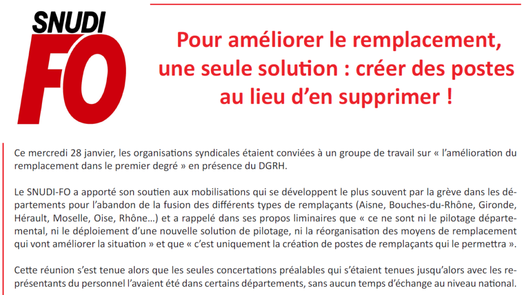 Pour améliorer le remplacement, une seule solution : créer des postes au lieu d’en supprimer ! 29 janvier 2026 par admin4997, publié dans ABSENCES & CONGES, REMPLACANTS 260129 communique SNUDI-FO GT remplaçantsTélécharger