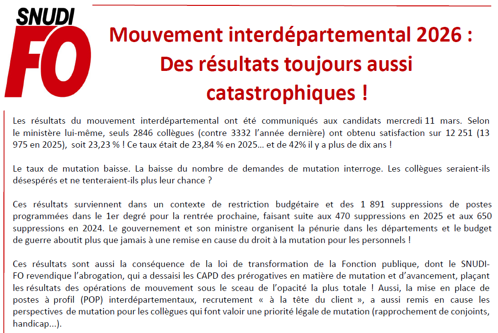 Mouvement interdépartemental 2026 : Des résultats toujours aussi catastrophiques ! 19 mars 2026 par admin4997, publié dans MOUVEMENT INTER (PERMUTATIONS) 260312-Communique-SNUDI-FO-mutations-inter-20261Télécharger