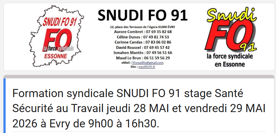 Formation syndicale SNUDI FO 91 stage Santé Sécurité au Travail jeudi 28 MAI et vendredi 29 MAI 2026 à Evry de 9h00 à 16h30. 13 avril 2026 par admin4997, publié dans FORMATION / ANIM PEDA Inscription à la formation ici –> https://forms.gle/Smgpome8q5ioGLkg8