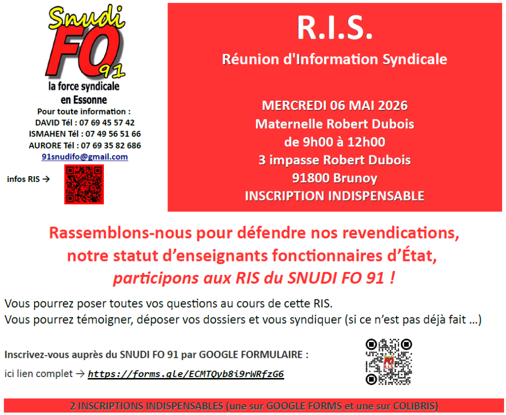 R.I.S. le mercredi 06 mai 2026 de 9H00 à 12H00 école maternelle Robert Dubois à Brunoy 29 avril 2026 par admin4997, publié dans Réunions d'Information Syndicale Inscrivez-vous auprès du SNUDI FO 91 par GOOGLE FORMULAIRE ici lien complet → https://forms.gle/ECMTQyb8i9rWRfzG6 RIS SNUDI FO 91 mercredi 06 MAI 2026 MATER ROBERT DUBOIS BRUNOYTélécharger